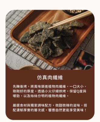 成份:組織化植物蛋白(非基因改造大豆分離蛋白、非基因改造脫脂大豆粉、小麥蛋白、玉米澱粉)、D-山梨醇液70%(甜味劑)、麥芽糖漿、大豆沙拉油、甘油(品質改良劑)、豌豆粉、砂糖、醬油、鹽、酵母抽出物、九層塔粉、白胡椒粉、調味劑(5’-次黃嘌呤核苷磷酸二鈉、5’-鳥嘌呤核苷磷酸二鈉)、香料、大豆水解蛋白、麥芽糊精、甘草、肉桂、肉豆蔻、丁香、陳皮。